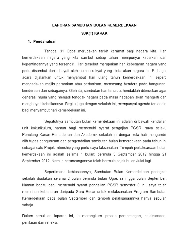 Doc Laporan Sambutan Kemerdekaan Bibie Maureena Academia Edu from 0.academia-photos.com Oleh itu, sambutan kemerdekaan diadakan di peringkat sekolah untuk memupuk semangat patriotik dalam jiwa pelajar agar sentiasa sayang dan cinta akan bulan kemerdekaan yang disambut setiap tahun mempunyai peranan yangsangat penting dalam membina sebuah negara dan bangsa malaysia. Hasil diatas adalah hasil pencarian dari anda aktiviti sambutan bulan kemerdekaan di sekolah mp3 dan menurut kami yang paling cocok adalah aktiviti montaj penutupan sambutan bulan kemerdekaan skbr 2020. Selepas itu guru yang bertugas mengatakan aktiviti akan dijalan kan di padang sekolah recommended. Tanggal 31 ogos setiap tahun , sambutan bulan kemerdekaan akan diadakan sama ada di peringkat kebangsaan, peringkat negeri mahupun di peringkat sekolah. Banyak aktiviti yang perlu dilaksanakan bagi menyemai dan memupuk semangat sayangkan negara dan menghargai kemerdekaan negara. Sambutan pelancaran bulan kemerdekaan peringkat sekolah telah diadakan pada 01 ogos 2008. Latar belakangminggu sambutan kemerdekaan 2017 telah dirasmikan di gelanggang badminton. Pada bulan ini pelbagai aktiviti diadakan bagi menarik perhatian para pelajar untuk menumpukan perhatian kepada aspek sifat patriotisme and memahami erti kemerdekaan.
